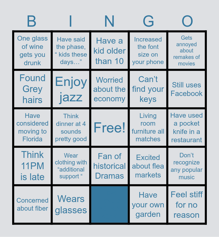 This bingo card has a free space and 24 words: Wear clothing with “additional support “, Wears glasses, Worried about the economy, Concerned about fiber, Gets annoyed about remakes of movies, One glass of wine gets you drunk, Found Grey hairs, Have said the phase, “ kids these days…”, Living room furniture all matches, Fan of historical Dramas, Can’t find your keys, Have considered moving to Florida, Excited about flea markets, Don’t recognize any popular music, Enjoy jazz, Have your own garden, Have used a pocket knife in a restaurant, Have a kid older than 10, Still uses Facebook, Think dinner at 4 sounds pretty good, Feel stiff for no reason, Think 11PM is late, Increased the font size on your phone and Have Have a 401KA 401K.