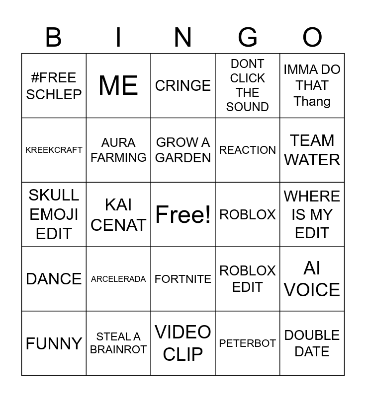 This bingo card has a free space and 24 words: ARCELERADA, STEAL A BRAINROT, GROW A GARDEN, FUNNY, IMMA DO THAT Thang, #FREE SCHLEP, KREEKCRAFT, ME, ROBLOX, FORTNITE, REACTION, SKULL EMOJI EDIT, ROBLOX EDIT, AI VOICE, AURA FARMING, PETERBOT, WHERE IS MY EDIT, CRINGE, TEAM WATER, KAI CENAT, DOUBLE DATE, DANCE, DONT CLICK THE SOUND and VIDEO CLIP.