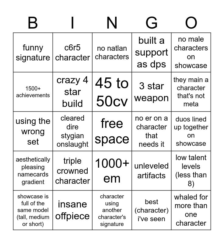 This bingo card has a free space and 24 words: triple crowned character, insane offpiece, 45 to 50cv, showcase is full of the same model (tall, medium or short), no male characters on showcase, funny signature, 1500+ achievements, c6r5 character, no er on a character that needs it, 1000+ em, 3 star weapon, using the wrong set, unleveled artifacts, low talent levels (less than 8), crazy 4 star build, best (character) i've seen, duos lined up together on showcase, no natlan characters, they main a character that's not meta, cleared dire stygian onslaught, whaled for more than one character, aesthetically pleasing namecards gradient, built a support as dps and character using another character's signature.