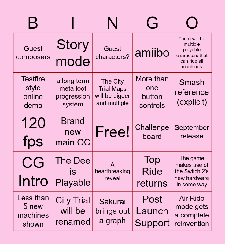 This bingo card has a free space and 24 words: The Dee is Playable, City Trial will be renamed, The City Trial Maps will be bigger and multiple, Less than 5 new machines shown, There will be multiple playable characters that can ride all machines, Guest composers, Testfire style online demo, Story mode, Challenge board, A heartbreaking reveal, More than one button controls, 120 fps, Top Ride returns, The game makes use of the Switch 2's new hardware in some way, a long term meta loot progression system, Post Launch Support, September release, Guest characters?, Smash reference (explicit), Brand new main OC, Air Ride mode gets a complete reinvention, CG Intro, amiibo and Sakurai brings out a graph.