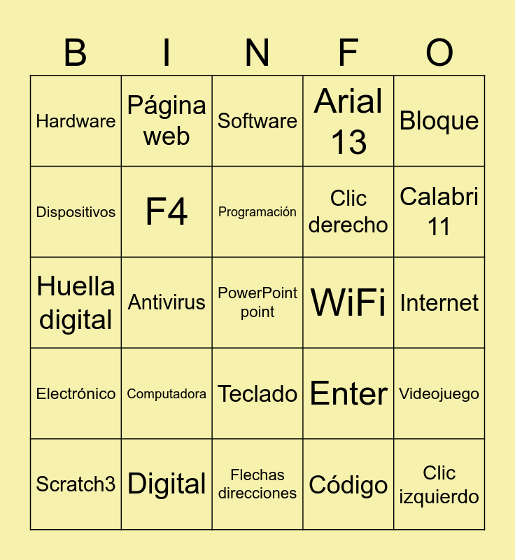 This bingo card has a free space and 24 words: Scratch3, Computadora, Programación, Código, Bloque, Hardware, Página web, Software, WiFi, Internet, Huella digital, F4, Enter, Videojuego, Dispositivos, Digital, Flechas direcciones, Arial 13, Calabri 11, Electrónico, Antivirus, Teclado, Clic derecho and Clic izquierdo.