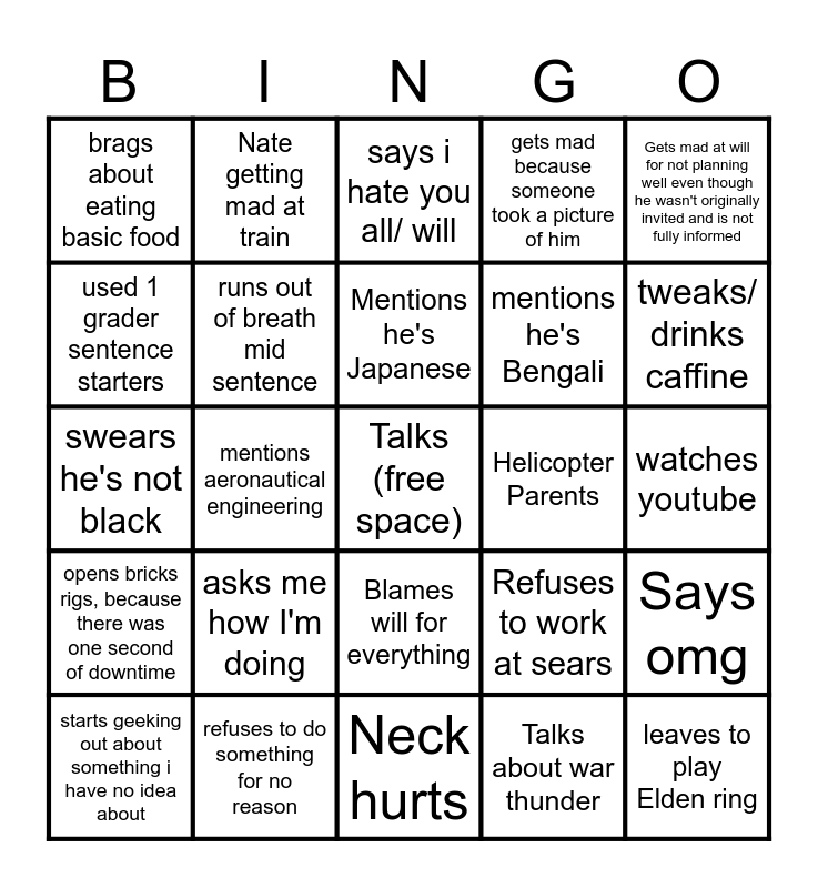 This bingo card has a free space and 24 words: starts geeking out about something i have no idea about, asks me how I'm doing, Mentions he's Japanese, Talks about war thunder, Gets mad at will for not planning well even though he wasn't originally invited and is not fully informed, brags about eating basic food, Nate getting mad at train, says i hate you all/ will, Helicopter Parents, watches youtube, swears he's not black, runs out of breath mid sentence, Refuses to work at sears, Says omg, used 1 grader sentence starters, refuses to do something for no reason, Neck hurts, gets mad because someone took a picture of him, tweaks/ drinks caffine, opens bricks rigs, because there was one second of downtime, mentions aeronautical engineering, Blames will for everything, mentions he's Bengali and leaves to play Elden ring.