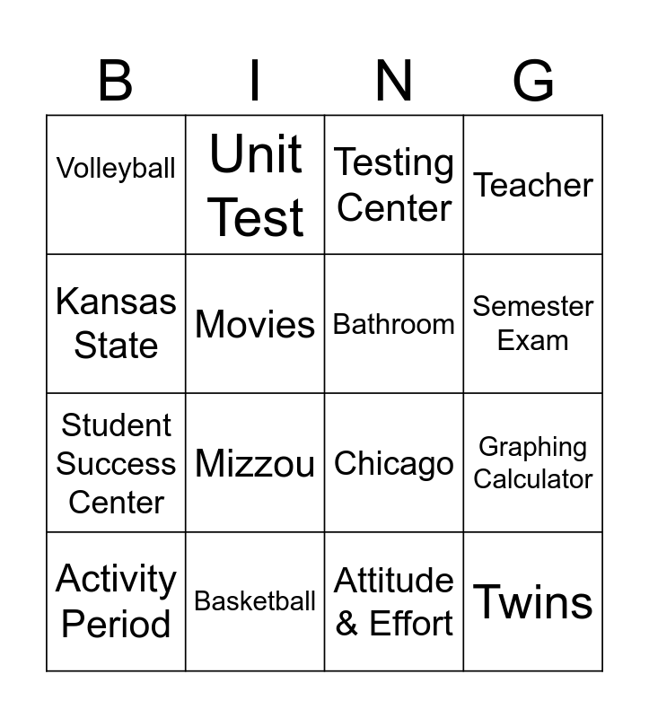 This bingo card has 16 words: Basketball, Graphing Calculator, Testing Center, Volleyball, Student Success Center, Unit Test, Chicago, Attitude & Effort, Kansas State, Movies, Activity Period, Teacher, Mizzou, Semester Exam, Bathroom and Twins.