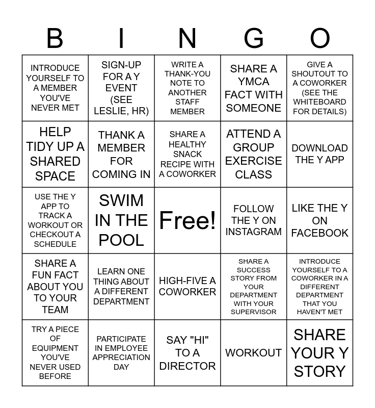 This bingo card has a free space and 24 words: LEARN ONE THING ABOUT A DIFFERENT DEPARTMENT, PARTICIPATE IN EMPLOYEE APPRECIATION DAY, SHARE A HEALTHY SNACK RECIPE WITH A COWORKER, TRY A PIECE OF EQUIPMENT YOU'VE NEVER USED BEFORE, GIVE A SHOUTOUT TO A COWORKER (SEE THE WHITEBOARD FOR DETAILS), INTRODUCE YOURSELF TO A MEMBER YOU'VE NEVER MET, HELP TIDY UP A SHARED SPACE, SIGN-UP FOR A Y EVENT (SEE LESLIE, HR), FOLLOW THE Y ON INSTAGRAM, HIGH-FIVE A COWORKER, ATTEND A GROUP EXERCISE CLASS, USE THE Y APP TO TRACK A WORKOUT OR CHECKOUT A SCHEDULE, SHARE A SUCCESS STORY FROM YOUR DEPARTMENT WITH YOUR SUPERVISOR, INTRODUCE YOURSELF TO A COWORKER IN A DIFFERENT DEPARTMENT THAT YOU HAVEN'T MET, THANK A MEMBER FOR COMING IN, WORKOUT, LIKE THE Y ON FACEBOOK, WRITE A THANK-YOU NOTE TO ANOTHER STAFF MEMBER, DOWNLOAD THE Y APP, SWIM IN THE POOL, SHARE YOUR Y STORY, SHARE A FUN FACT ABOUT YOU TO YOUR TEAM, SHARE A YMCA FACT WITH SOMEONE and SAY "HI" TO A DIRECTOR.