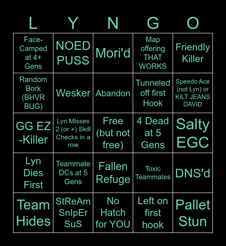 This bingo card has a free space and 24 words: Teammate DCs at 5 Gens, StReAm SnIpEr SuS, Abandon, Team Hides, Friendly Killer, Face-Camped at 4+ Gens, Random Bork (BHVR BUG), NOED PUSS, 4 Dead at 5 Gens, Fallen Refuge, Tunneled off first Hook, GG EZ -Killer, Toxic Teammates, DNS'd, Wesker, Left on first hook, Salty EGC, Mori'd, Speedo Ace (not Lyn) or KILT JEANS DAVID, Lyn Misses 2 (or +) Skill Checks in a row, Pallet Stun, Lyn Dies First, Map offering THAT WORKS and No Hatch for YOU.