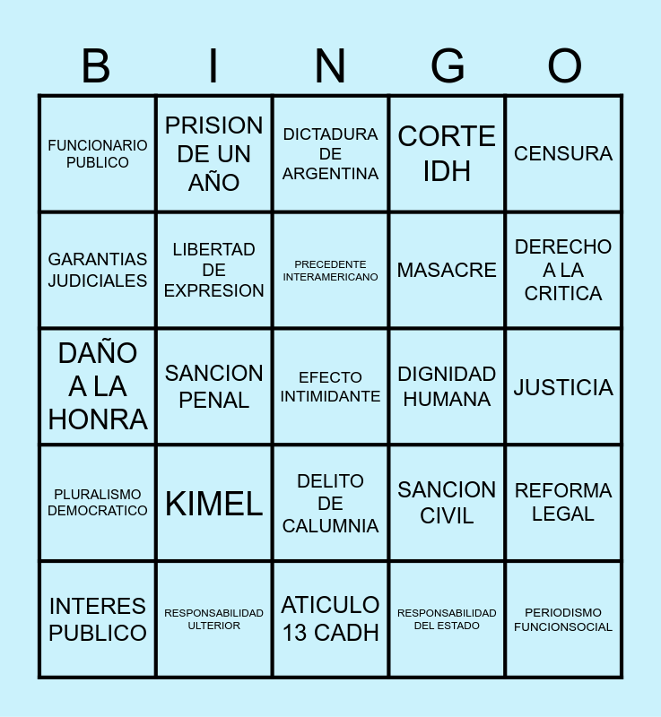 This bingo card has a free space and 24 words: INTERES PUBLICO, KIMEL, PRECEDENTE INTERAMERICANO, RESPONSABILIDAD DEL ESTADO, CENSURA, FUNCIONARIO PUBLICO, PRISION DE UN AÑO, DICTADURA DE ARGENTINA, DIGNIDAD HUMANA, JUSTICIA, DAÑO A LA HONRA, LIBERTAD DE EXPRESION, SANCION CIVIL, REFORMA LEGAL, GARANTIAS JUDICIALES, RESPONSABILIDAD ULTERIOR, ATICULO 13 CADH, CORTE IDH, DERECHO A LA CRITICA, PLURALISMO DEMOCRATICO, SANCION PENAL, DELITO DE CALUMNIA, MASACRE and PERIODISMO FUNCIONSOCIAL.