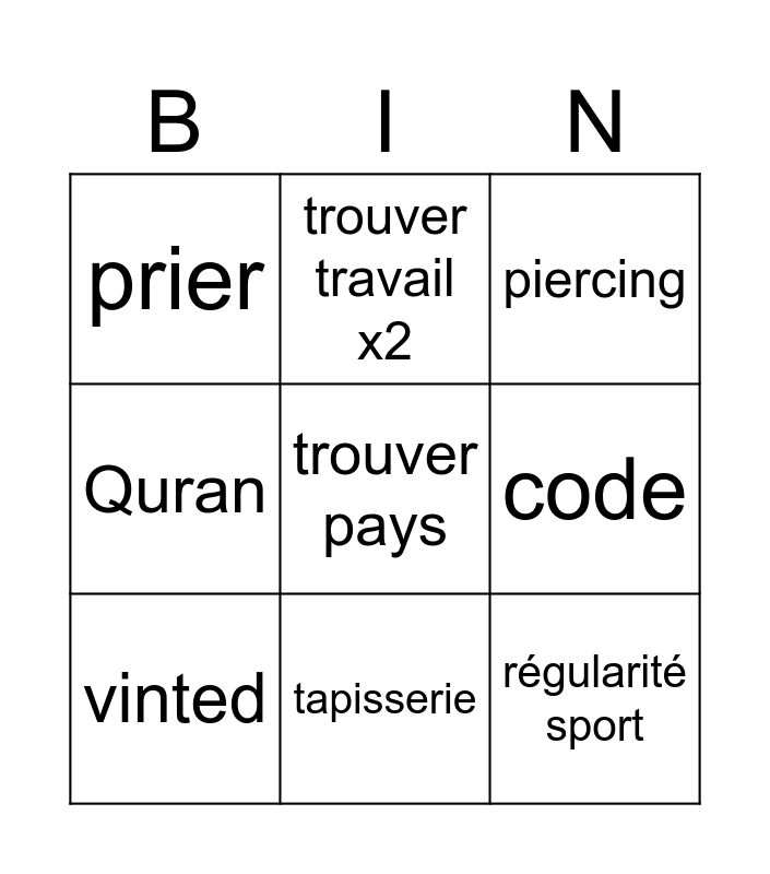 This bingo card has a free space and 8 words: code, piercing, trouver travail x2, vinted, prier, régularité sport, Quran and tapisserie.