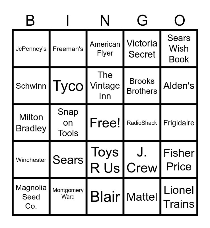 This bingo card has a free space and 24 words: Sears, Montgomery Ward, The Vintage Inn, Magnolia Seed Co., Sears Wish Book, JcPenney's, Schwinn, Freeman's, RadioShack, Toys R Us, Brooks Brothers, Milton Bradley, J. Crew, Fisher Price, Tyco, Mattel, Frigidaire, American Flyer, Alden's, Snap on Tools, Lionel Trains, Winchester, Victoria Secret and Blair.