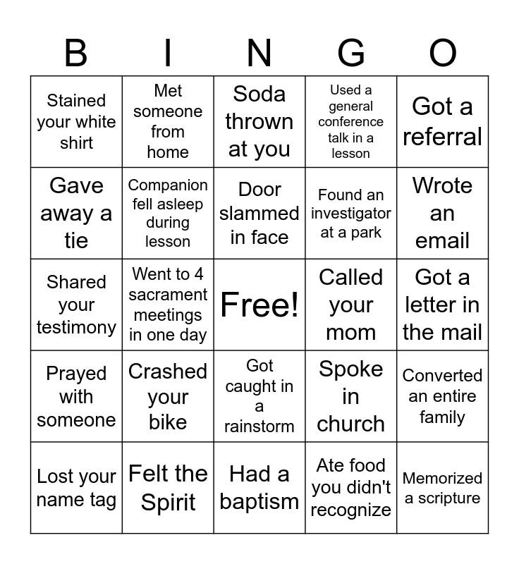 This bingo card has a free space and 34 words: Taught the Restoration, Ate food you didn't recognize, Sang a hymn in a lesson, Got chased by a dog, Prayed with someone, Companion fell asleep during lesson, Got a referral, Lost your name tag, Met someone from home, Got a flat tire, Door slammed in face, Soda thrown at you, Had your groceries paid for, Knocked 20+ doors in a day, Called your mom, Wrote an email, Felt the Spirit, Shared your testimony, Crashed your bike, Spoke in church, Got caught in a rainstorm, Played basketball, Stained your white shirt, Got a letter in the mail, Had a baptism, Memorized a scripture, Used a general conference talk in a lesson, Stayed home due to cold weather, Found an investigator at a park, Gave away a tie, Fasted all day, Went to 4 sacrament meetings in one day, Converted an entire family and Went to the temple.