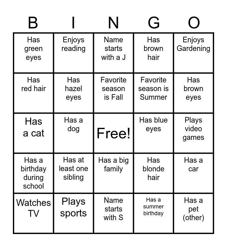 This bingo card has a free space and 24 words: Has at least one sibling, Plays sports, Favorite season is Fall, Watches TV, Enjoys Gardening, Has green eyes, Has red hair, Enjoys reading, Has blue eyes, Has a big family, Favorite season is Summer, Has a cat, Has blonde hair, Has a car, Has hazel eyes, Has a summer birthday, Plays video games, Name starts with a J, Has brown eyes, Has a dog, Has a pet (other), Has a birthday during school, Has brown hair and Name starts with S.