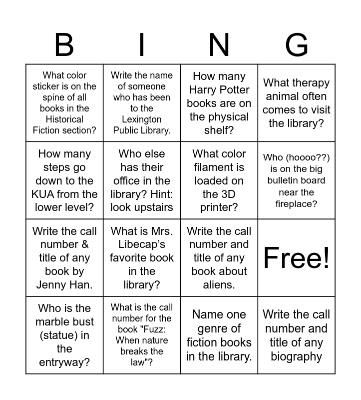This bingo card has 20 words: Free!, What newspaper does the library subscribe to?, How many Harry Potter books are on the physical shelf?, Take a group selfie with a book you have all read., Who is the marble bust (statue) in the entryway?, How many steps go down to the KUA from the lower level?, What is the call number for the book "Fuzz: When nature breaks the law"?, What color sticker is on the spine of all books in the Historical Fiction section?, Write the call number & title of any book by Jenny Han., Write the name of someone who has been to the Lexington Public Library., What is Mrs. Libecap’s favorite book in the library?, Write the call number and title of any book about aliens., Who else has their office in the library? Hint: look upstairs, Write the call number and title of any biography, What color filament is loaded on the 3D printer?, Write the name of one machine in the Makerspace., Who (hoooo??) is on the big bulletin board near the fireplace?, What therapy animal often comes to visit the library?, Name one genre of fiction books in the library. and Write the name of one of the current library helpers..