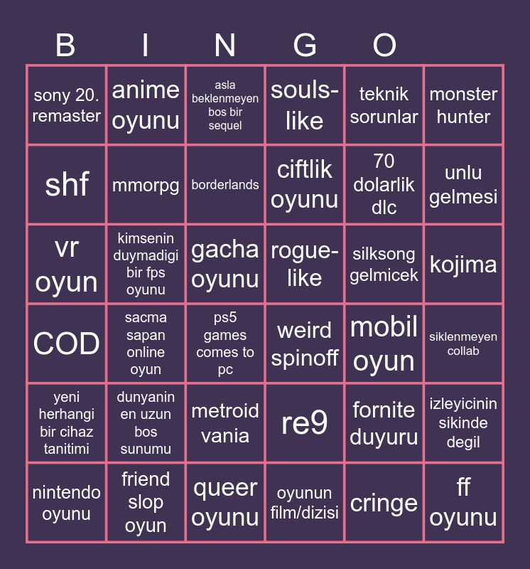 This bingo card has 36 words: COD, sacma sapan online oyun, queer oyunu, ciftlik oyunu, silksong gelmicek, kojima, sony 20. remaster, friend slop oyun, asla beklenmeyen bos bir sequel, re9, 70 dolarlik dlc, monster hunter, yeni herhangi bir cihaz tanitimi, kimsenin duymadigi bir fps oyunu, borderlands, souls-like, fornite duyuru, siklenmeyen collab, shf, mmorpg, ps5 games comes to pc, weird spinoff, mobil oyun, izleyicinin sikinde degil, vr oyun, anime oyunu, gacha oyunu, oyunun film/dizisi, teknik sorunlar, unlu gelmesi, nintendo oyunu, dunyanin en uzun bos sunumu, metroid vania, rogue-like, cringe and ff oyunu.