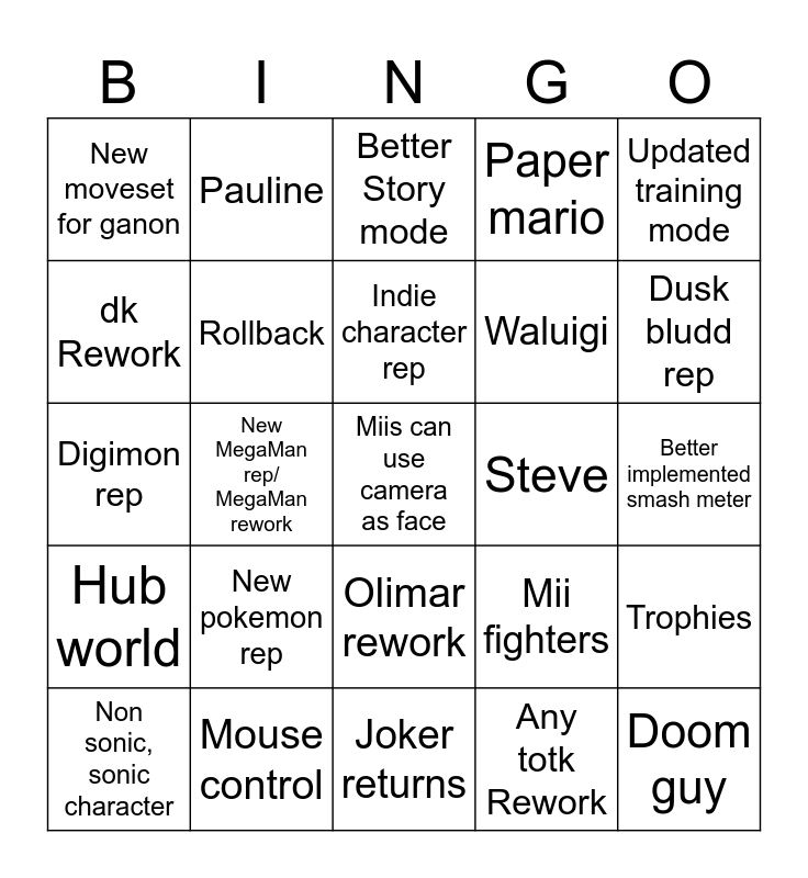 This bingo card has 25 words: New pokemon rep, Joker returns, Indie character rep, Non sonic, sonic character, Updated training mode, New moveset for ganon, dk Rework, Pauline, Steve, Olimar rework, Waluigi, Digimon rep, Mii fighters, Trophies, Rollback, Doom guy, Better implemented smash meter, Better Story mode, Dusk bludd rep, New MegaMan rep/ MegaMan rework, Miis can use camera as face, Mouse control, Hub world, Paper mario and Any totk Rework.