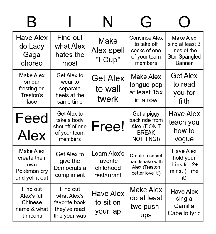 This bingo card has a free space and 25 words: Get Alex to give the Democrats a compliment, Have Alex to sit on your lap, Get Alex to wall twerk, Find out Alex's full Chinese name & what it means, Make Alex sing at least 3 lines of the Star Spangled Banner, Have Alex do Lady Gaga choreo, Make Alex smear frosting on Treston's face, Find out what Alex hates the most, Get a piggy back ride from Alex (DON'T BREAK NOTHING!), Learn Alex's favorite childhood restaurant, Make Alex tongue pop at least 15x in a row, Feed Alex, Create a secret handshake with Alex (Treston better love it!), Have Alex hold your drink for 2+ mins. (Time it), Get Alex to wear to separate heels at the same time, Make Alex put on make-up, Have Alex teach you how to vogue, Make Alex spell "I Cup", Get Alex to read you for filth, Get Alex to take a body shot off of one of your team members, Have Alex sing a Camilla Cabello lyric, Find out what Alex's favorite book they've read this year was, Make Alex create their own Pokémon cry and yell it out, Convince Alex to take off socks of one of your team members and Make Alex do at least two push-ups.