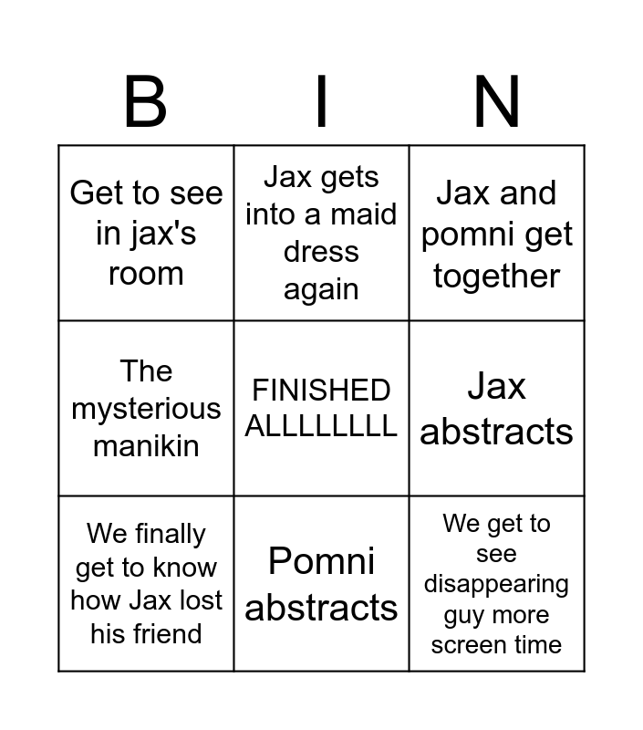This bingo card has a free space and 8 words: Jax abstracts, Jax and pomni get together, Jax gets into a maid dress again, We finally get to know how Jax lost his friend, Get to see in jax's room, We get to see disappearing guy more screen time, The mysterious manikin and Pomni abstracts.