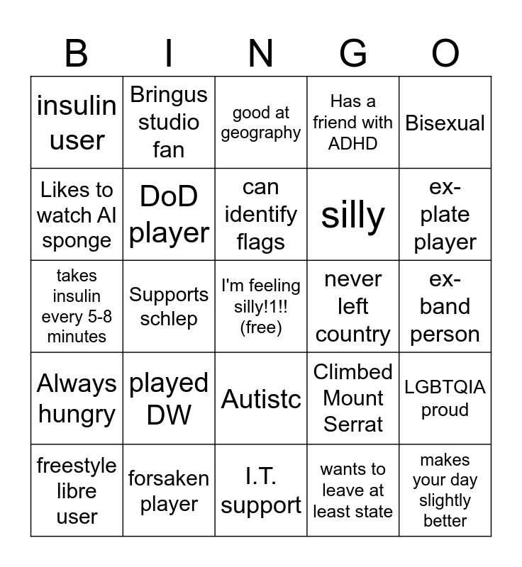 This bingo card has a free space and 29 words: type 1 diabetic, forsaken player, good at geography, Brazilian, Bisexual, insulin user, DoD player, can identify flags, never left country, LGBTQIA proud, freestyle libre user, Supports schlep, wants to leave at least state, makes your day slightly better, takes insulin every 5-8 minutes, good at being bad, I.T. support, Climbed Mount Serrat, ex-plate player, Always hungry, played DW, Likes P.E., silly, ex-band person, Likes to watch AI sponge, Bringus studio fan, Autistc, Has a friend with ADHD and Diautism (Diabetes+Autism).