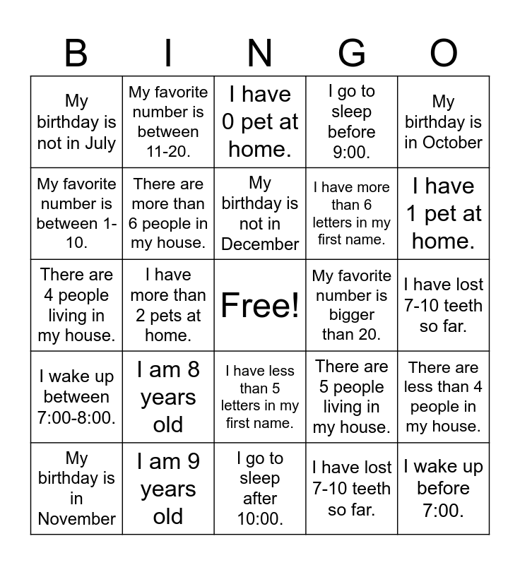 This bingo card has a free space and 24 words: I am 8 years old, I am 9 years old, My birthday is not in December, My birthday is in November, My birthday is in October, My birthday is not in July, My favorite number is between 1-10., My favorite number is between 11-20., My favorite number is bigger than 20., I have less than 5 letters in my first name., I have more than 6 letters in my first name., There are 4 people living in my house., There are 5 people living in my house., There are less than 4 people in my house., There are more than 6 people in my house., I have lost 7-10 teeth so far., I have lost 7-10 teeth so far., I have 0 pet at home., I have 1 pet at home., I have more than 2 pets at home., I wake up before 7:00., I wake up between 7:00-8:00., I go to sleep before 9:00. and I go to sleep after 10:00..