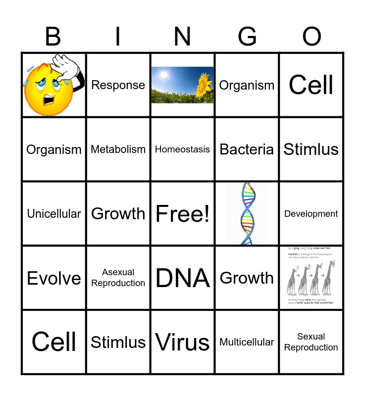 This bingo card has 7 images, a free space and 34 words: Biology, Unicellular, Multicellular, Metabolism, Stimlus, DNA, Homeostasis, Response, Cell, Evolve, Growth, Organism, Sexual Reproduction, Development, Asexual Reproduction, Virus, Bacteria, Biology, Unicellular, Multicellular, Metabolism, Stimlus, DNA, Homeostasis, Response, Cell, Evolve, Growth, Organism, Reproduction, Development, Bacteria, Humans and Virus.