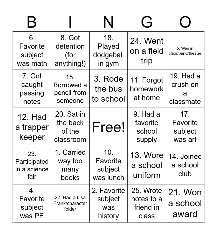 This bingo card has a free space and 25 words: 1. Carried way too many books, 2. Favorite subject was history, 3. Rode the bus to school, 4. Favorite subject was PE, 5. Was in choir/band/theater, 6. Favorite subject was math, 7. Got caught passing notes, 8. Got detention (for anything!), 9. Had a favorite school supply, 10. Favorite subject was lunch, 11. Forgot homework at home, 12. Had a trapper keeper, 13. Wore a school uniform, 14. Joined a school club, 15. Borrowed a pencil from someone, 16. Loved cafeteria pizza, 17. Favorite subject was art, 18. Played dodgeball in gym, 19. Had a crush on a classmate, 20. Sat in the back of the classroom, 21. Won a school award, 22. Had a Lisa Frank/character folder, 23. Participated in a science fair, 24. Went on a field trip and 25. Wrote notes to a friend in class.