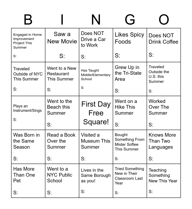 This bingo card has a free space and 24 words: Read a Book Over the Summer S:, Went to a NYC Public School S:, Has Taught Middle/Elementary School S:, Has More Than One Pet S:, Does NOT Drink Coffee S:, Engaged in Home Improvement Project This Summer S:, Traveled Outside of NYC This Summer S:, Saw a New Movie S:, Went on a Hike This Summer S:, Visited a Museum This Summer S:, Grew Up in the Tri-State Area S:, Plays an Instrument/Sings S:, Bought Something From Mister Softee This Summer S:, Knows More Than Two Languages S:, Went to a New Restaurant This Summer S:, Tried Something New in Their Classroom Last Year S:, Worked Over The Summer S:, Does NOT Drive a Car to Work S:, Traveled Outside the U.S. this Summer S:, Went to the Beach this Summer S:, Teaching Something New This Year S:, Was Born in the Same Season S:, Likes Spicy Foods S: and Lives in the Same Borough as you! S:.