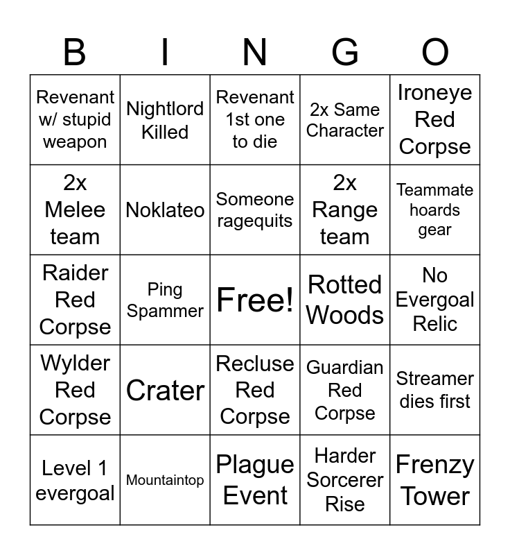 This bingo card has a free space and 29 words: Level 1 evergoal, Skips level 1 camp, Ping Spammer, Basement Bell Bearing, Revenant w/ stupid weapon, Revenant 1st one to die, Noklateo, Crater, Rotted Woods, Mountaintop, No Evergoal Relic, Frenzy Tower, Plague Event, Harder Sorcerer Rise, Teammate hoards gear, Revenant Red Corpse, Recluse Red Corpse, Wylder Red Corpse, Ironeye Red Corpse, Raider Red Corpse, Guardian Red Corpse, Evergoal brainrot, 2x Range team, 2x Melee team, 2x Same Character, Nightlord Killed, Streamer dies first, Someone ragequits and Missed ult.