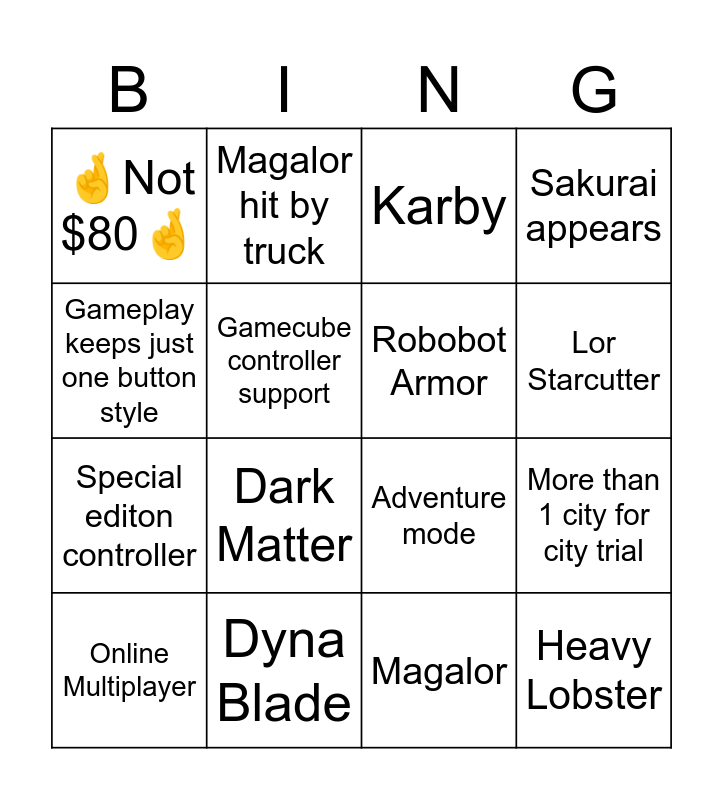 This bingo card has 16 words: Dyna Blade, More than 1 city for city trial, Karby, 🤞Not $80🤞, Special editon controller, Magalor hit by truck, Adventure mode, Magalor, Gameplay keeps just one button style, Gamecube controller support, Online Multiplayer, Sakurai appears, Dark Matter, Lor Starcutter, Robobot Armor and Heavy Lobster.