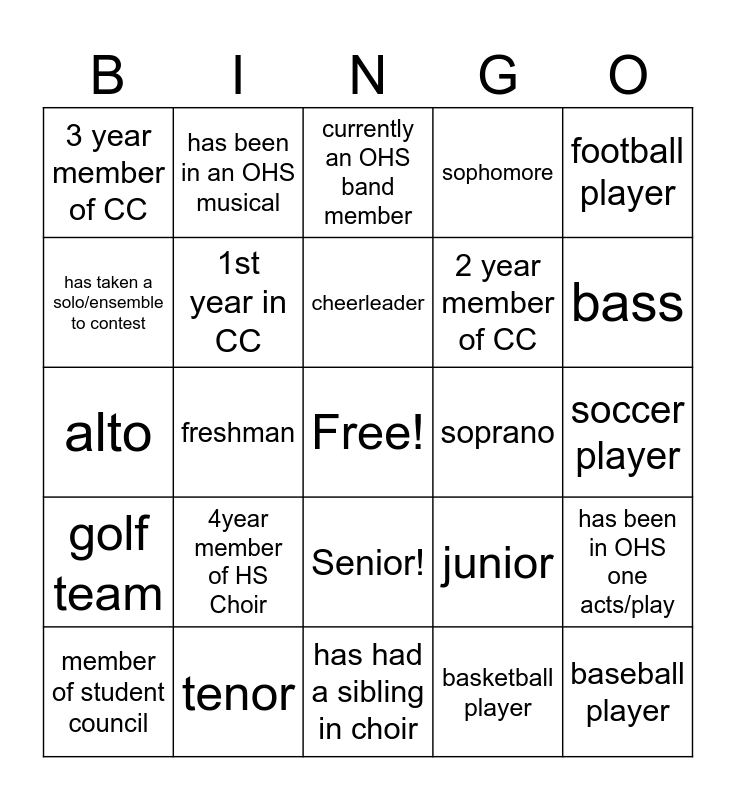 This bingo card has a free space and 24 words: 4year member of HS Choir, tenor, cheerleader, member of student council, football player, 3 year member of CC, has taken a solo/ensemble to contest, has been in an OHS musical, soprano, Senior!, 2 year member of CC, alto, junior, has been in OHS one acts/play, 1st year in CC, basketball player, soccer player, currently an OHS band member, bass, freshman, baseball player, golf team, sophomore and has had a sibling in choir.