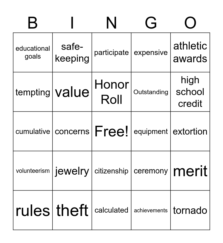 This bingo card has a free space and 29 words: rules, succeeding, concerns, two-way, educational goals, participate, value, jewelry, equipment, theft, extortion, tornado, calculated, achievements, high school credit, accomplishments, citizenship, volunteerism, athletic awards, cumulative, ceremony, Bert O'Keefe, Outstanding, tempting, expensive, safe-keeping, merit, Honor Roll and performing arts.