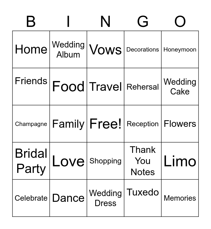 This bingo card has a free space and 29 words: Celebrate, Bridal Shower, Family, Invitations, Home, Vows, Food, Love, Reception, Dance, Flowers, Memories, Wedding Dress, Tuxedo, Wedding Cake, Venue, Shopping, Bridal Party, Honeymoon, Champagne, Thank You Notes, Ring, Rehersal, Friends, Decorations, Wedding Album, Limo, Travel and Jewelry.