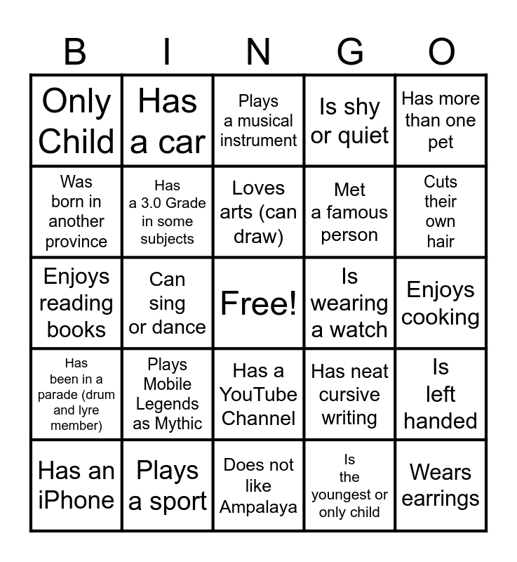 This bingo card has a free space and 24 words: Has an iPhone, Plays Mobile Legends as Mythic, Loves arts (can draw), Is the youngest or only child, Has more than one pet, Only Child, Has a car, Plays a musical instrument, Is wearing a watch, Enjoys cooking, Enjoys reading books, Has a 3.0 Grade in some subjects, Has neat cursive writing, Is left handed, Was born in another province, Plays a sport, Does not like Ampalaya, Is shy or quiet, Cuts their own hair, Has been in a parade (drum and lyre member), Can sing or dance, Has a YouTube Channel, Met a famous person and Wears earrings.