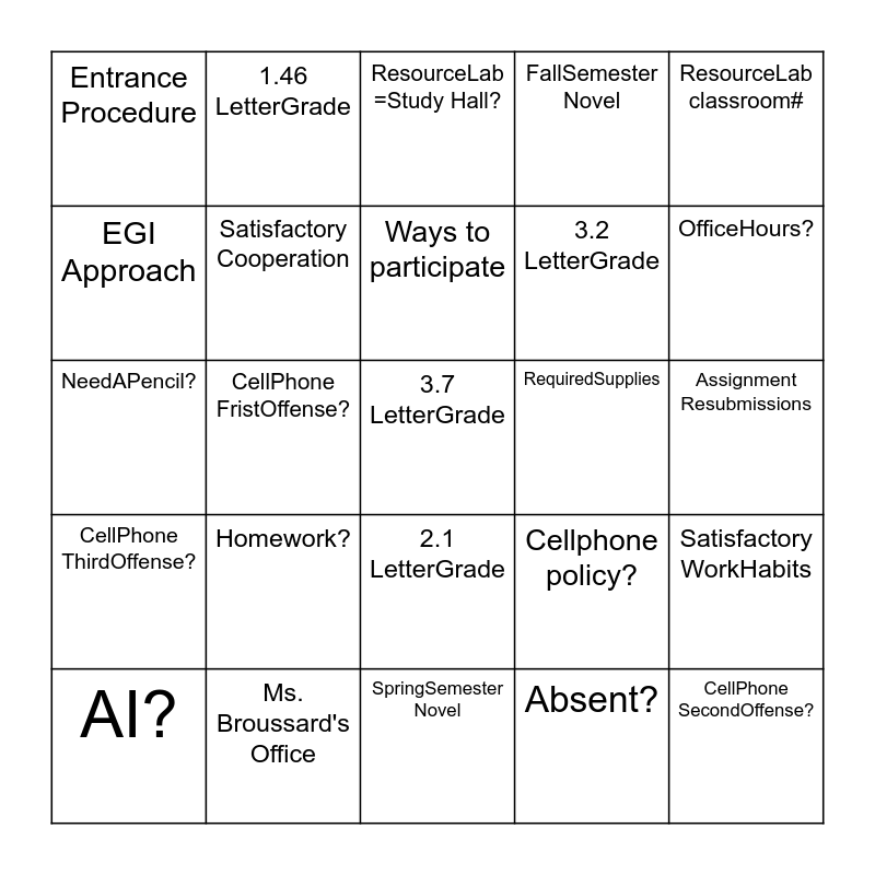 This bingo card has a free space and 24 words: Homework?, Ms. Broussard's Office, Ways to participate, AI?, ResourceLab classroom#, Entrance Procedure, EGI Approach, 1.46 LetterGrade, RequiredSupplies, 2.1 LetterGrade, 3.2 LetterGrade, NeedAPencil?, Cellphone policy?, Satisfactory WorkHabits, Satisfactory Cooperation, Absent?, Assignment Resubmissions, ResourceLab =Study Hall?, OfficeHours?, CellPhone FristOffense?, CellPhone SecondOffense?, CellPhone ThirdOffense?, FallSemester Novel and SpringSemester Novel.