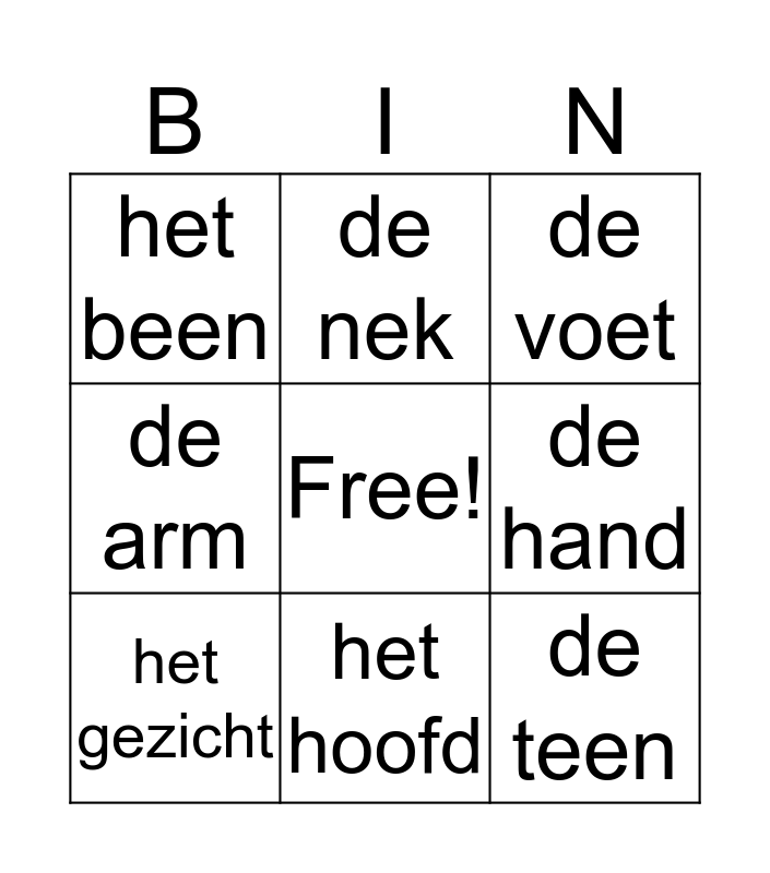 This bingo card has a free space and 8 words: de hand, de voet, de nek, het gezicht, het been, de teen, de arm and het hoofd.