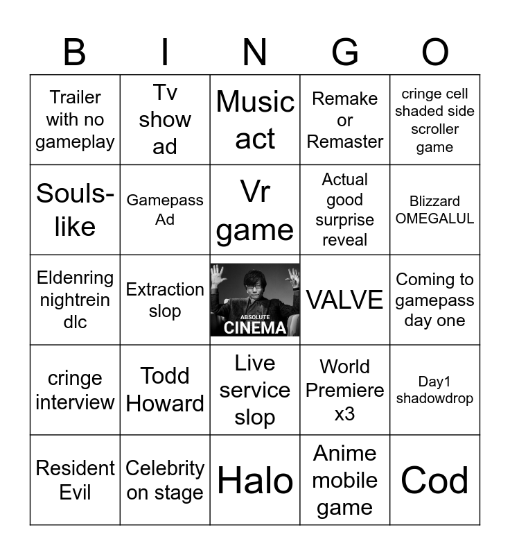 This bingo card has a free space and 24 words: Todd Howard, Celebrity on stage, Vr game, Resident Evil, cringe cell shaded side scroller game, Trailer with no gameplay, Souls-like, Tv show ad, VALVE, Live service slop, Actual good surprise reveal, Eldenring nightrein dlc, World Premiere x3, Day1 shadowdrop, Gamepass Ad, Anime mobile game, Coming to gamepass day one, Music act, Blizzard OMEGALUL, Extraction slop, Cod, cringe interview, Remake or Remaster and Halo.