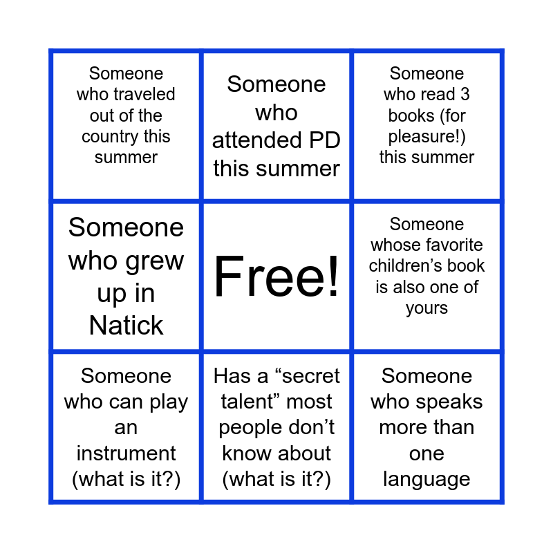 This bingo card has a free space and 9 words: Someone who can play an instrument (what is it?), Someone who attended PD this summer, Someone whose favorite children’s book is also one of yours, Someone who traveled out of the country this summer, Someone who read 3 books (for pleasure!) this summer, Someone who grew up in Natick, Has a “secret talent” most people don’t know about (what is it?), Someone who speaks more than one language and Someone who can actually nap on a nap mat.