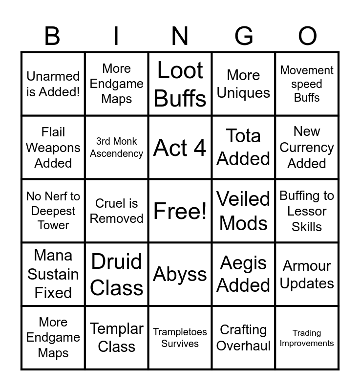 This bingo card has a free space and 24 words: Druid Class, Templar Class, Act 4, More Endgame Maps, Movement speed Buffs, Unarmed is Added!, Flail Weapons Added, More Endgame Maps, Veiled Mods, Abyss, Tota Added, No Nerf to Deepest Tower, Aegis Added, Armour Updates, 3rd Monk Ascendency, Crafting Overhaul, Buffing to Lessor Skills, Loot Buffs, New Currency Added, Cruel is Removed, Trading Improvements, Mana Sustain Fixed, More Uniques and Trampletoes Survives.