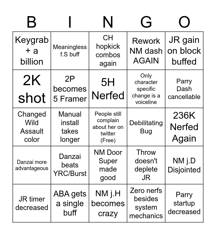 This bingo card has a free space and 24 words: Danzai beats YRC/Burst, ABA gets a single buff, 5H Nerfed, JR timer decreased, JR gain on block buffed, Keygrab + a billion, 2K shot, Meaningless f.S buff, Debilitating Bug, NM Door Super made good, Only character specific change is a voiceline, Changed Wild Assault color, Throw doesn't deplete JR, NM j.D Disjointed, 2P becomes 5 Framer, Zero nerfs besides system mechanics, 236K Nerfed Again, CH hopkick combos again, Parry Dash cancellable, Manual install takes longer, Parry startup decreased, Danzai more advantageous, Rework NM dash AGAIN and NM j.H becomes crazy.