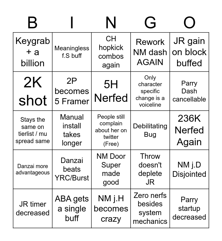 This bingo card has a free space and 24 words: Danzai beats YRC/Burst, ABA gets a single buff, 5H Nerfed, JR timer decreased, JR gain on block buffed, Keygrab + a billion, 2K shot, Meaningless f.S buff, Debilitating Bug, NM Door Super made good, Only character specific change is a voiceline, Stays the same on tierlist / mu spread same, Throw doesn't deplete JR, NM j.D Disjointed, 2P becomes 5 Framer, Zero nerfs besides system mechanics, 236K Nerfed Again, CH hopkick combos again, Parry Dash cancellable, Manual install takes longer, Parry startup decreased, Danzai more advantageous, Rework NM dash AGAIN and NM j.H becomes crazy.