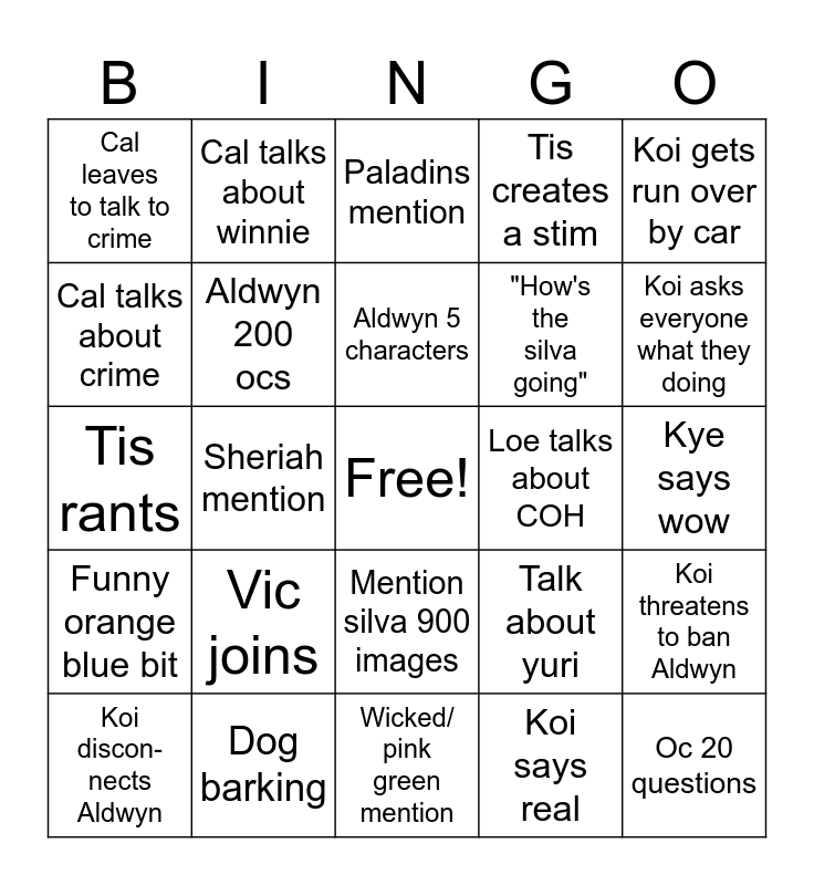 This bingo card has a free space and 26 words: Mention silva 900 images, Koi says real, Aldwyn 5 characters, Dog barking, Koi gets run over by car, Cal leaves to talk to crime, Cal talks about crime, Cal talks about winnie, Kye says wow, Talk about yuri, "How's the silva going", Tis rants, Koi threatens to ban Aldwyn, Koi discon- nects Aldwyn, Sheriah mention, Koi complains about weather, Tis creates a stim, Funny orange blue bit, Paladins mention, Oc 20 questions, Koi asks everyone what they doing, Wicked/ pink green mention, Loe talks about COH, Vic joins, Aldwyn 200 ocs and Koi says "good morning".
