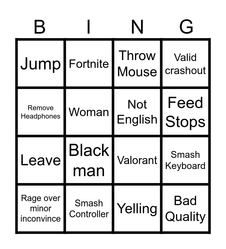 This bingo card has 16 words: Smash Controller, Smash Keyboard, Throw Mouse, Jump, Leave, Fortnite, Valorant, Yelling, Remove Headphones, Woman, Rage over minor inconvince, Valid crashout, Black man, Feed Stops, Not English and Bad Quality.