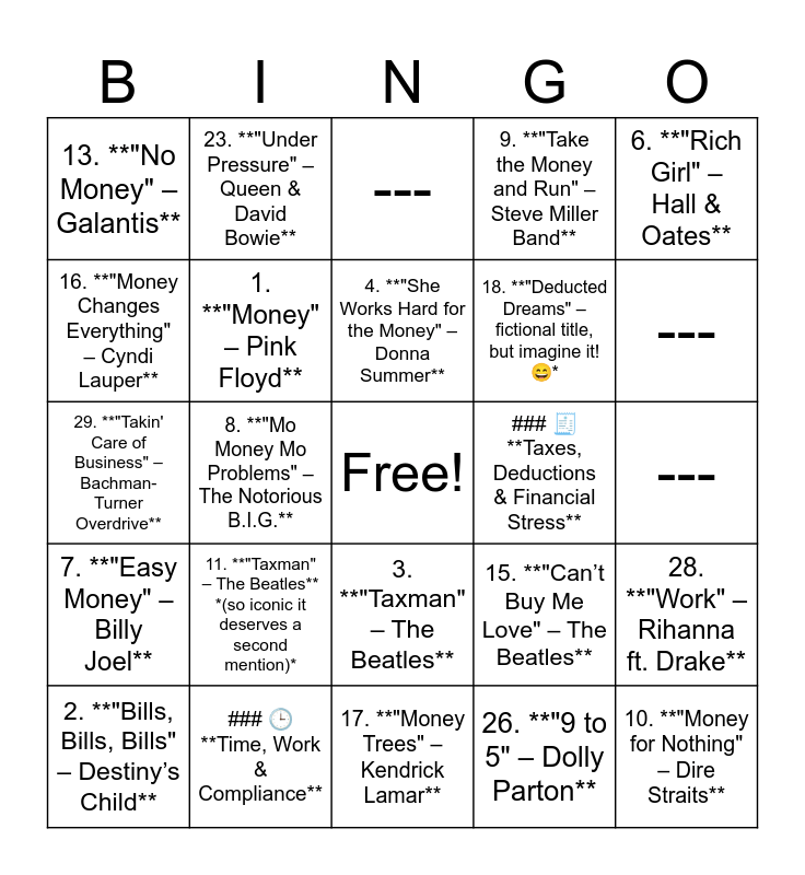 This bingo card has a free space and 39 words: Great addition! Here's an updated and themed list of **songs and artists** that can be connected to **payroll systems**, now including **error handling, deductions, and taxes** β all the fun stuff that makes payroll so thrilling π, ---, ### πΈ **Money, Paychecks & Deductions**, 1. **"Money" β Pink Floyd**, 2. **"Bills, Bills, Bills" β Destinyβs Child**, 3. **"Taxman" β The Beatles**, 4. **"She Works Hard for the Money" β Donna Summer**, 5. **"I Need a Dollar" β Aloe Blacc**, 6. **"Rich Girl" β Hall & Oates**, 7. **"Easy Money" β Billy Joel**, 8. **"Mo Money Mo Problems" β The Notorious B.I.G.**, 9. **"Take the Money and Run" β Steve Miller Band**, 10. **"Money for Nothing" β Dire Straits**, ---, ### π§Ύ **Taxes, Deductions & Financial Stress**, 11. **"Taxman" β The Beatles** *(so iconic it deserves a second mention)*, 12. **"Too Much" β Spice Girls** *(for when deductions feel overwhelming)*, 13. **"No Money" β Galantis**, 14. **"Price Tag" β Jessie J ft. B.o.B**, 15. **"Canβt Buy Me Love" β The Beatles**, 16. **"Money Changes Everything" β Cyndi Lauper**, 17. **"Money Trees" β Kendrick Lamar**, 18. **"Deducted Dreams" β fictional title, but imagine it! π*, ---, ### β οΈ **Errors, Corrections & System Glitches**, 19. **"Oops!... I Did It Again" β Britney Spears** *(payroll error vibes)*, 20. **"Human Error" β Oh Land**, 21. **"Error" β Madeline Juno**, 22. **"Lost in the System" β fictional but fitting!*, 23. **"Under Pressure" β Queen & David Bowie**, 24. **"Stressed Out" β Twenty One Pilots**, 25. **"Fix You" β Coldplay** *(for the payroll team fixing mistakes)*, ---, ### π **Time, Work & Compliance**, 26. **"9 to 5" β Dolly Parton**, 27. **"Working for the Weekend" β Loverboy**, 28. **"Work" β Rihanna ft. Drake**, 29. **"Takin' Care of Business" β Bachman-Turner Overdrive** and 30. **"Deadline" β Group 1 Crew**.