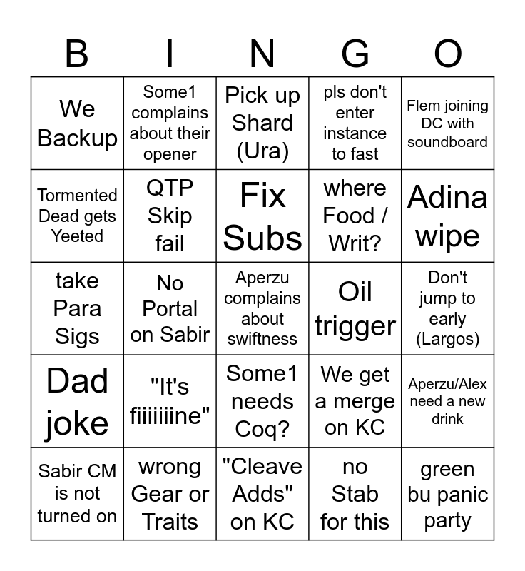 This bingo card has 25 words: "It's fiiiiiiine", "Cleave Adds" on KC, Fix Subs, Sabir CM is not turned on, Flem joining DC with soundboard, We Backup, Tormented Dead gets Yeeted, Some1 complains about their opener, Oil trigger, Some1 needs Coq?, where Food / Writ?, take Para Sigs, We get a merge on KC, Aperzu/Alex need a new drink, QTP Skip fail, green bu panic party, Don't jump to early (Largos), Pick up Shard (Ura), Adina wipe, No Portal on Sabir, Aperzu complains about swiftness, wrong Gear or Traits, Dad joke, pls don't enter instance to fast and no Stab for this.