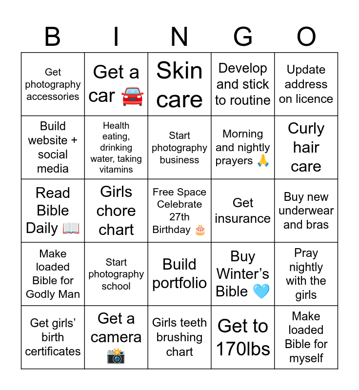 This bingo card has a free space and 24 words: Start photography school, Get a camera 📸, Start photography business, Get girls’ birth certificates, Update address on licence, Get photography accessories, Build website + social media, Get a car 🚘, Get insurance, Build portfolio, Morning and nightly prayers 🙏, Read Bible Daily 📖, Buy Winter’s Bible 🩵, Pray nightly with the girls, Health eating, drinking water, taking vitamins, Get to 170lbs, Buy new underwear and bras, Skin care, Curly hair care, Girls chore chart, Make loaded Bible for myself, Make loaded Bible for Godly Man, Develop and stick to routine and Girls teeth brushing chart.