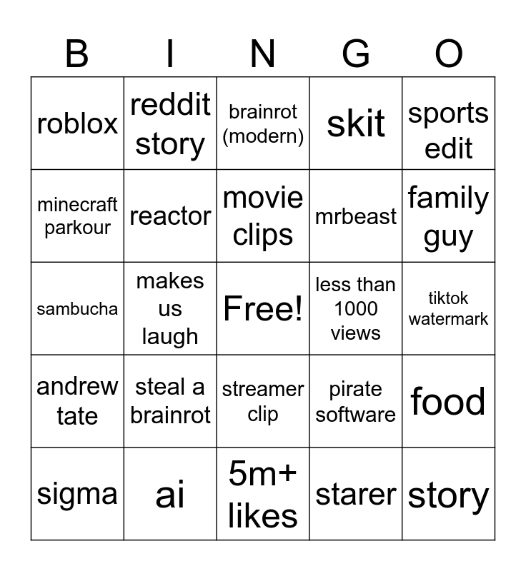 This bingo card has a free space and 24 words: steal a brainrot, ai, movie clips, sigma, sports edit, roblox, minecraft parkour, reddit story, less than 1000 views, streamer clip, mrbeast, sambucha, pirate software, food, reactor, starer, tiktok watermark, brainrot (modern), family guy, makes us laugh, story, andrew tate, skit and 5m+ likes.