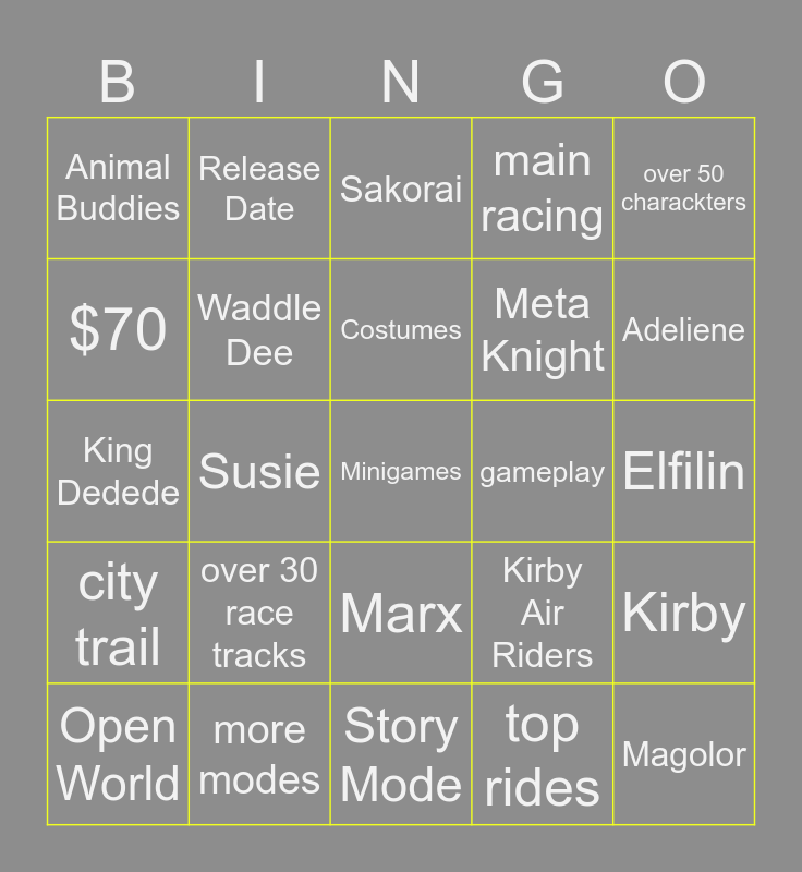 This bingo card has 25 words: over 30 race tracks, Story Mode, Costumes, Open World, over 50 charackters, Animal Buddies, $70, Release Date, gameplay, Marx, Meta Knight, King Dedede, Kirby Air Riders, Kirby, Waddle Dee, Magolor, Elfilin, Sakorai, Adeliene, Susie, Minigames, more modes, city trail, main racing and top rides.