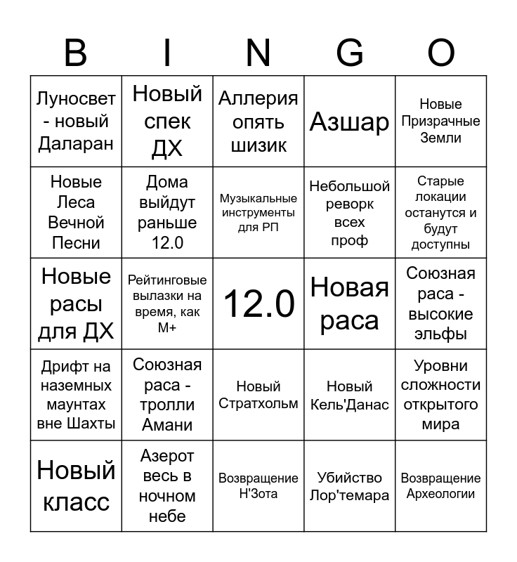 This bingo card has a free space and 24 words: Союзная раса - тролли Амани, Азерот весь в ночном небе, Музыкальные инструменты для РП, Новый класс, Новые Призрачные Земли, Луносвет - новый Даларан, Новые Леса Вечной Песни, Новый спек ДХ, Новая раса, Новый Стратхольм, Небольшой реворк всех проф, Новые расы для ДХ, Новый Кель'Данас, Уровни сложности открытого мира, Дома выйдут раньше 12.0, Убийство Лор'темара, Союзная раса - высокие эльфы, Аллерия опять шизик, Старые локации останутся и будут доступны, Рейтинговые вылазки на время, как М+, Возвращение Археологии, Дрифт на наземных маунтах вне Шахты, Азшар and Возвращение Н'Зота.
