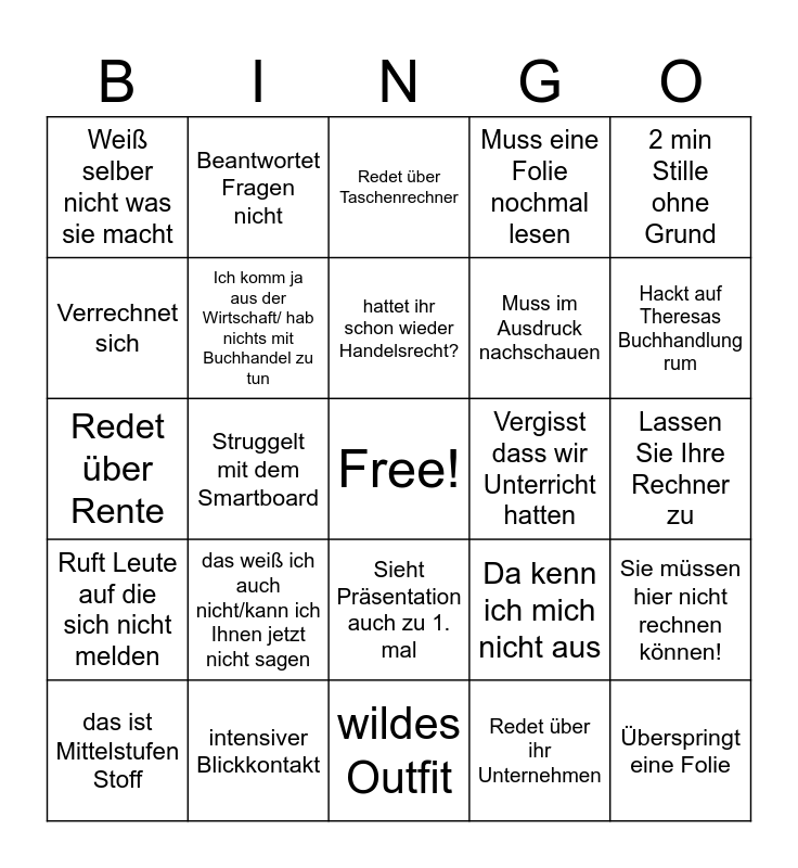 This bingo card has a free space and 24 words: das weiß ich auch nicht/kann ich Ihnen jetzt nicht sagen, intensiver Blickkontakt, hattet ihr schon wieder Handelsrecht?, das ist Mittelstufen Stoff, 2 min Stille ohne Grund, Weiß selber nicht was sie macht, Verrechnet sich, Beantwortet Fragen nicht, Vergisst dass wir Unterricht hatten, Sieht Präsentation auch zu 1. mal, Muss im Ausdruck nachschauen, Redet über Rente, Da kenn ich mich nicht aus, Sie müssen hier nicht rechnen können!, Ich komm ja aus der Wirtschaft/ hab nichts mit Buchhandel zu tun, Redet über ihr Unternehmen, Lassen Sie Ihre Rechner zu, Redet über Taschenrechner, Hackt auf Theresas Buchhandlung rum, Struggelt mit dem Smartboard, Überspringt eine Folie, Ruft Leute auf die sich nicht melden, Muss eine Folie nochmal lesen and wildes Outfit.