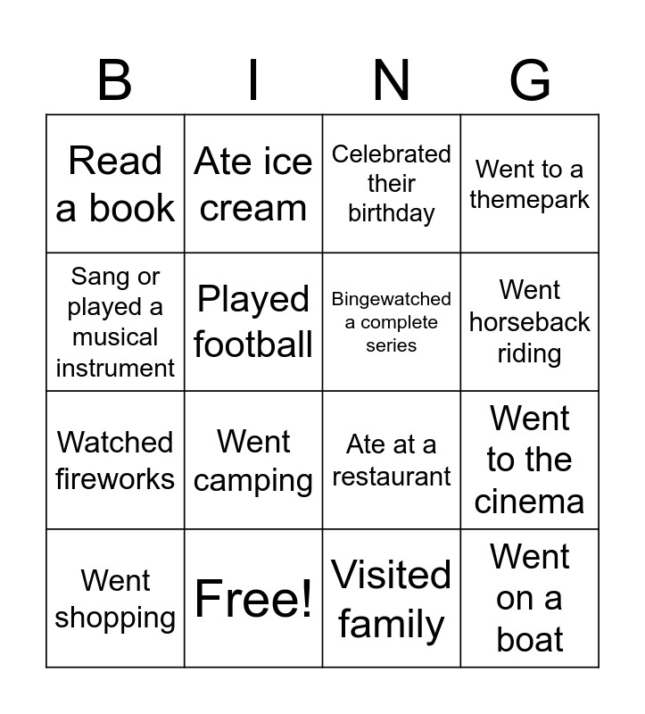 This bingo card has 22 words: Free!, Went swimming, Ate ice cream, Visited the beach, Played football, Bingewatched a complete series, Read a book, Celebrated their birthday, Ate at a restaurant, Went on a boat, Watched fireworks, Went to a themepark, Travelled by airplane, Slept past noon (12:00), Visited family, Had a barbeque, Went to the cinema, Went shopping, Went camping, Sang or played a musical instrument, Went horseback riding and Went to a festival or concert.