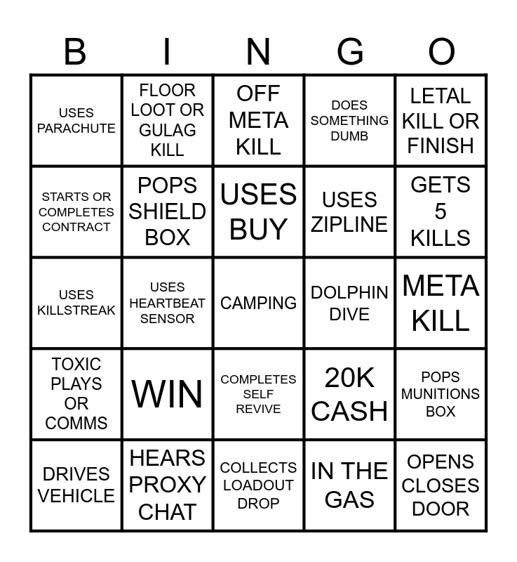 This bingo card has 25 words: WIN, COLLECTS LOADOUT DROP, USES BUY, DRIVES VEHICLE, LETAL KILL OR FINISH, USES PARACHUTE, STARTS OR COMPLETES CONTRACT, FLOOR LOOT OR GULAG KILL, DOLPHIN DIVE, COMPLETES SELF REVIVE, USES ZIPLINE, USES KILLSTREAK, 20K CASH, POPS MUNITIONS BOX, POPS SHIELD BOX, OPENS CLOSES DOOR, META KILL, OFF META KILL, GETS 5 KILLS, USES HEARTBEAT SENSOR, CAMPING, HEARS PROXY CHAT, TOXIC PLAYS OR COMMS, DOES SOMETHING DUMB and IN THE GAS.