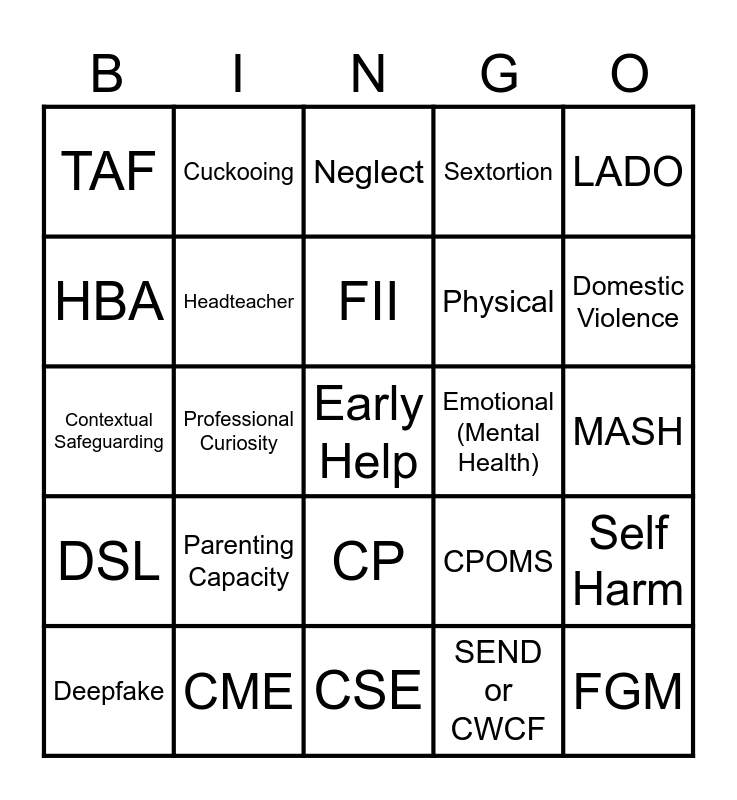 This bingo card has a free space and 29 words: Deepfake, CCE, Professional Curiosity, PREVENT, TAF, Neglect, Headteacher, Parenting Capacity, Emotional (Mental Health), CME, MASH, FGM, CSE, SEND or CWCF, Domestic Violence, LCSS, CP, DSL, LADO, Contextual Safeguarding, CPOMS, AI, Physical, HBA, Sextortion, Cuckooing, Self Harm, FII and Bullying.