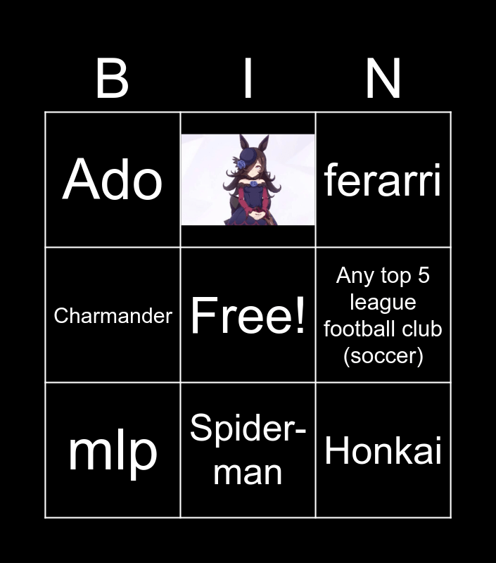 This bingo card has 1 images, a free space and 7 words: Any top 5 league football club (soccer), ferarri, mlp, Ado, Honkai, Charmander and Spider-man.